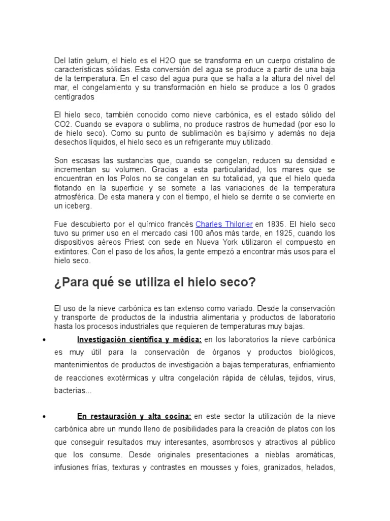 Hielo seco en escamas, pellets y bloques para hostelería, restauración, limpieza criogénica y transportes de alimentos y medicamentos¡distribuidor nacional! El uso del hielo seco está muy extendido en la alta cocina porque al sublimarse (así se llama a la aunque es algo cuyo uso parece propiedad exclusiva de la alta cocina, hacer hielo seco en casa es. Hielo seco dióxido de carbono en estado sólido que se utiliza para refrigerar (el hielo seco sirve para apagar incendios). Recibe este nombre, porque, pese a parecerse al hielo normal o a la nieve por su aspecto y temperatura, cuando se sublima no deja residuo de humedad porque su base no es agua y su estado natural es gaseoso. Alimentos carbonatados con hielo seco.